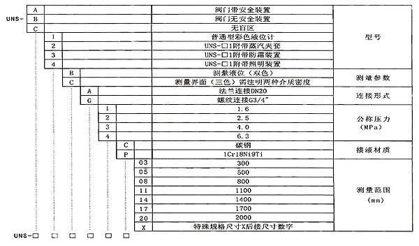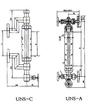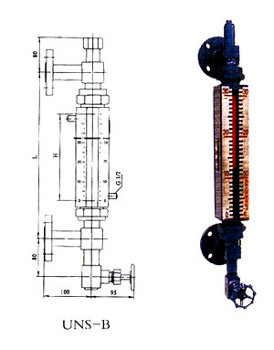 UNS(UGS)系列彩色石英管液位計(以下簡稱彩色液位計)是采用國內外高科技研制而成,它是普通玻璃板液位計更新換代產品,它廣泛用于石油、化工、電力、冶金等行業各種透明液體容器和鍋爐上,如,水、汽油、液化氣、液氨、丙烷、丙烯,酸等油品和化工原料的液位測量,同時適用于二種不同介質密度的界面測量。彩色液位計安裝在各種容器及鍋爐上,直接觀測到液位變化,液相顯示呈現綠色,氣相顯示呈現紅色,界面測量呈三色分界面。液、氣顯示反差很大,在遠距離觀察、夜間巡視顯明清晰。它成功地克服了普通板式液位基本中,密封面積打、易滲漏,顯示不清晰,在很近距離難易判斷的缺點。它是目前國內外理想的直讀式液位計。