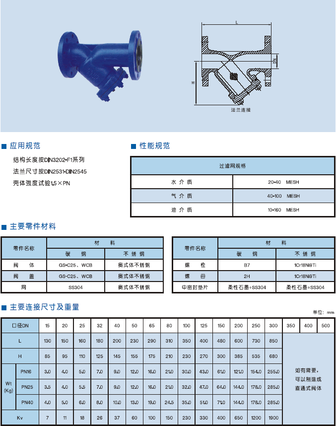 德標(biāo)Y型過濾器DIN3202-F1系列結(jié)構(gòu)長度標(biāo)準(zhǔn);DIN2531-2545法蘭標(biāo)準(zhǔn);殼體強(qiáng)度試驗為1.5*PN。